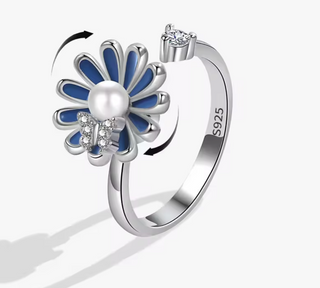 Anillo antiestrés de plata de ley con girasol y abeja – ajustable y giratorio